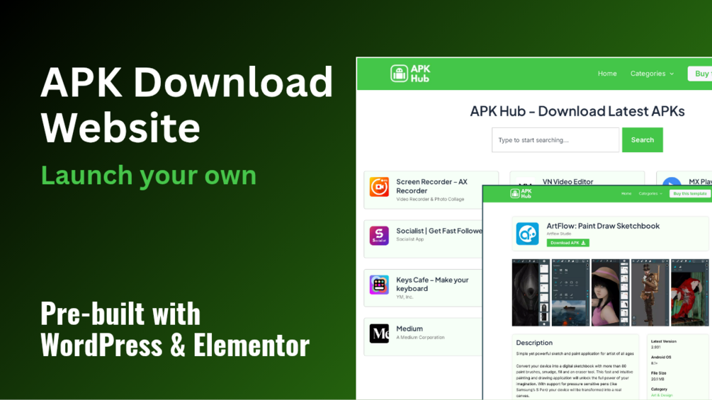 Start your own APK downloading website with this ready-made WordPress site. It’s perfect for anyone who wants to share Android APK files in a clean, organized, and easy-to-manage way.